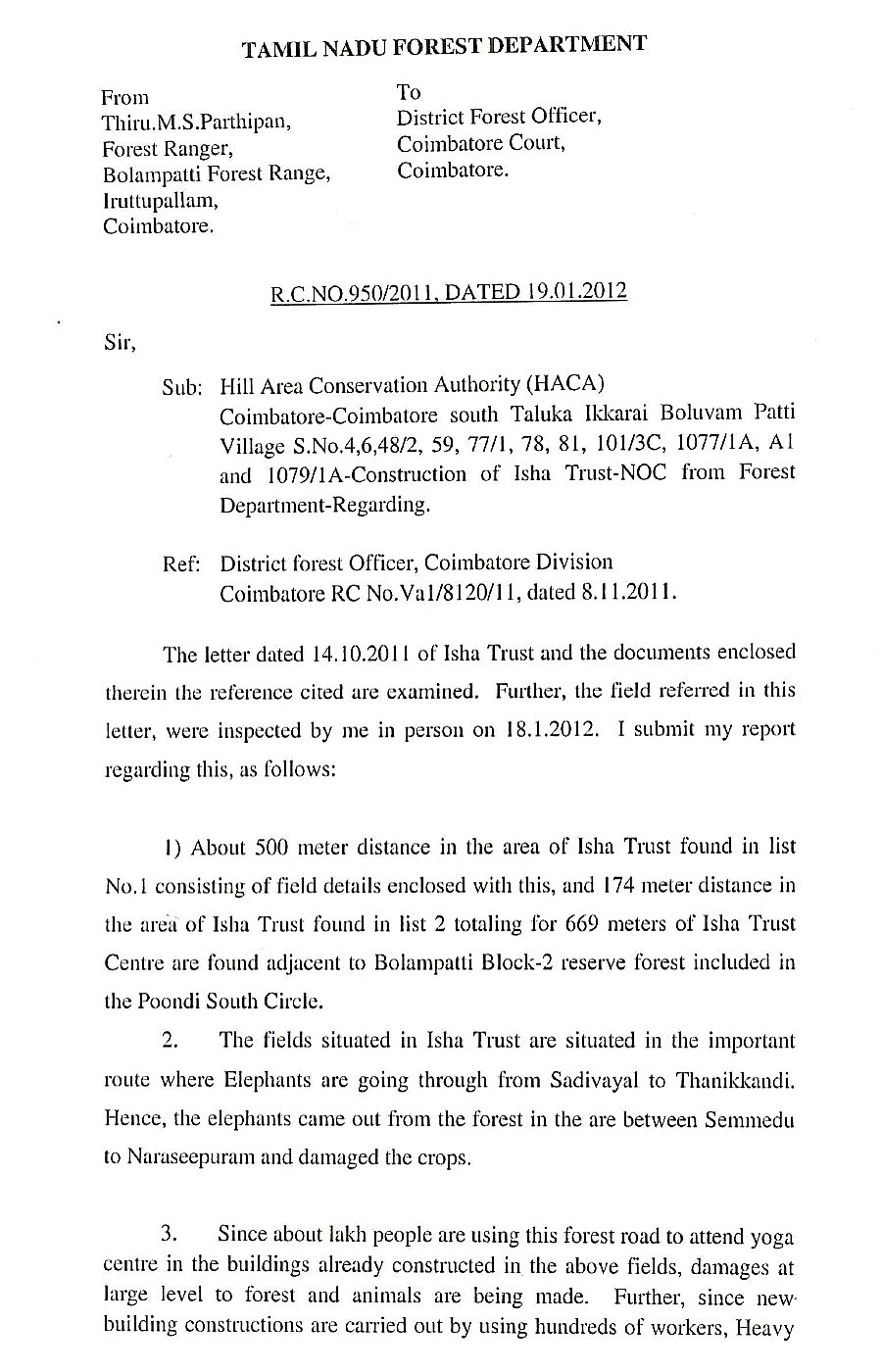 वन रेंजर एमएस पार्थिपन ने भी 2012 में ईशा आश्रम का दौरा किया था। उन्होंने पाया कि इसकी कुछ जमीनें उन मार्गों पर गिरती हैं, जहां हाथी सादिवायल और थानिक्कंडी के बीच आते थे। चूंकि ईशा ने इन जमीनों पर अवैध रूप से इमारतें, दीवारें और बिजली की बाड़ लगाई थी, हाथियों को सेमेदु और नरसीपुरम के बीच जंगल से बाहर निकलने के लिए मजबूर किया गया, फसलों को रौंद डाला और ग्रामीणों पर हमला किया।