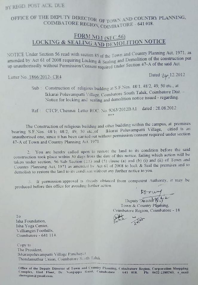 अंत में, दिसंबर 2012 में, योजना विभाग ने ईशा को एक महीने के भीतर सभी अवैध संरचनाओं को ध्वस्त करने का निर्देश देते हुए एक और नोटिस भेजा। फाउंडेशन ने टाउन एंड कंट्री प्लानिंग कमिश्नर के सामने नोटिस को चुनौती दी। मामला अभी भी लटका हुआ है।