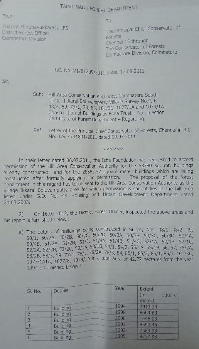 ईशा ने 2011 में एचएसीए से मंजूरी के लिए आवेदन किया था, लेकिन उन्होंने पहले ही कई संरचनाएं बना ली थीं। जुलाई 2011 में, वन विभाग के एक दस्तावेज से पता चलता है, ईशा ने एचएसीए को 63,380 वर्ग मीटर पर अवैध निर्माण के साथ-साथ 28582.52 वर्ग मीटर पर नए निर्माण को हरी झंडी दिखाने के लिए कहा। आवेदन पर विचार करते हुए, कोयंबटूर के तत्कालीन वन अधिकारी वी थिरुनावुक्कारासु ने फरवरी 2012 में ईशा आश्रम का दौरा किया। उन्होंने पाया कि ईशा ने 28,582.52 वर्ग मीटर के भूखंड सहित अवैध रूप से इमारतों की एक श्रृंखला का निर्माण किया था, जिसके लिए वह अनुमोदन के लिए एचएसीए के पास गई थी।