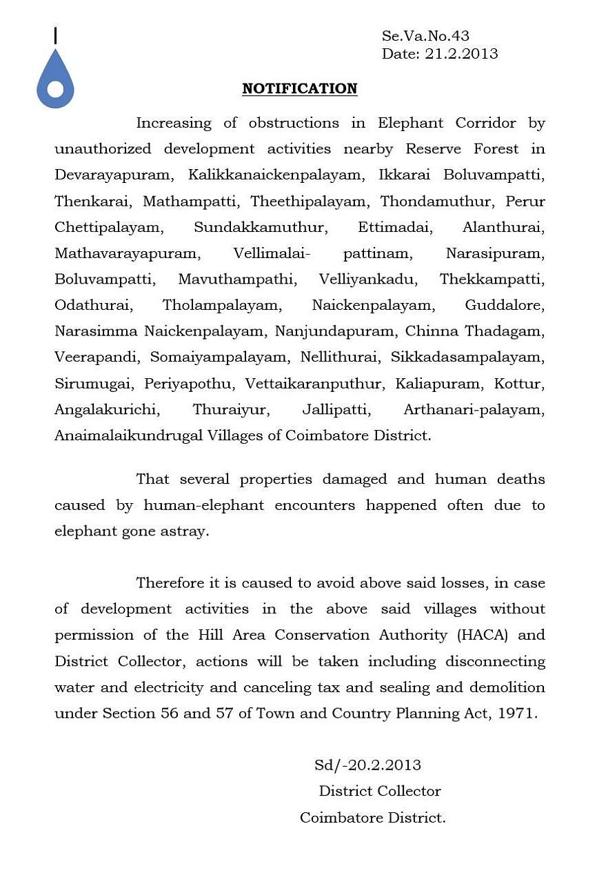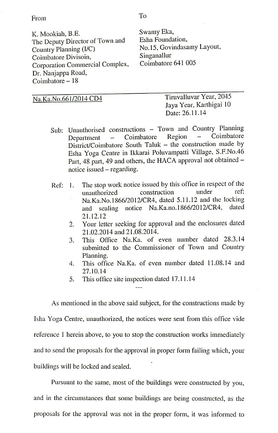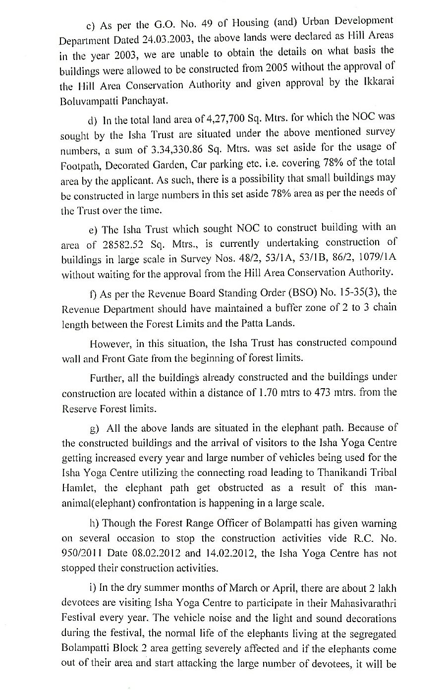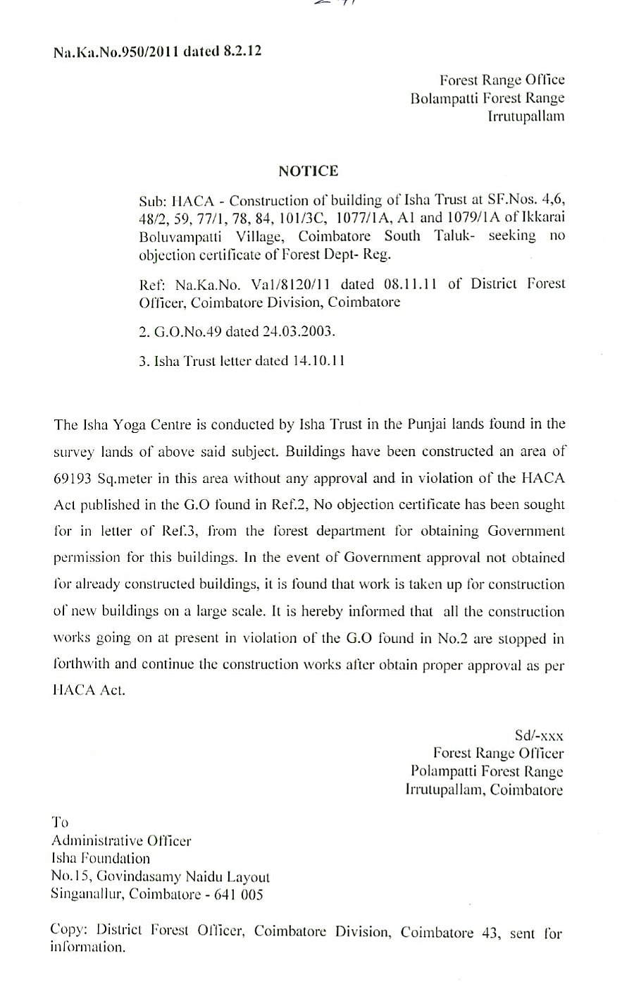 इसी तरह, जिला कलेक्टर द्वारा जारी 2013 की एक अधिसूचना में बिना किसी अनिश्चित शब्दों के कहा गया है, हालांकि ईशा का नाम लिए बिना, इक्कराई बोलुवमपट्टी में आरक्षित वन के पास अवैध निर्माण हाथियों के लिए गलियारे में तेजी से बाधा डाल रहा था, जिससे जानवरों के जीवन और संपत्ति को नुकसान हो रहा था। नोटिस में एचएसीए की मंजूरी के बिना बनाए गए परिसर की बिजली, पानी, सीलिंग और विध्वंस की धमकी दी गई थी।