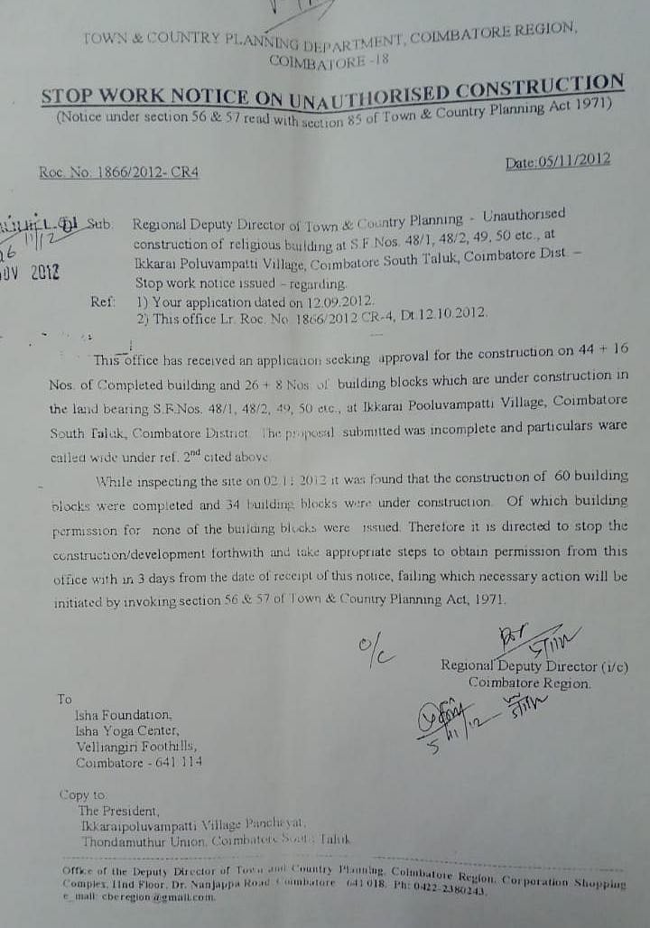 ईशा ने समय सीमा का उल्लंघन किया और सात महीने बाद ही एक नया आवेदन भेजा। इसके बाद, जब योजना अधिकारियों ने अक्टूबर 2012 में आश्रम का दौरा किया, तो उन्होंने पाया कि नए भवनों का निर्माण शुरू हो चुका था। उन्होंने नींव को तुरंत सभी निर्माण बंद करने का आदेश दिया और नवंबर 2012 में एक नोटिस जारी किया। ईशा ने परवाह नहीं की।