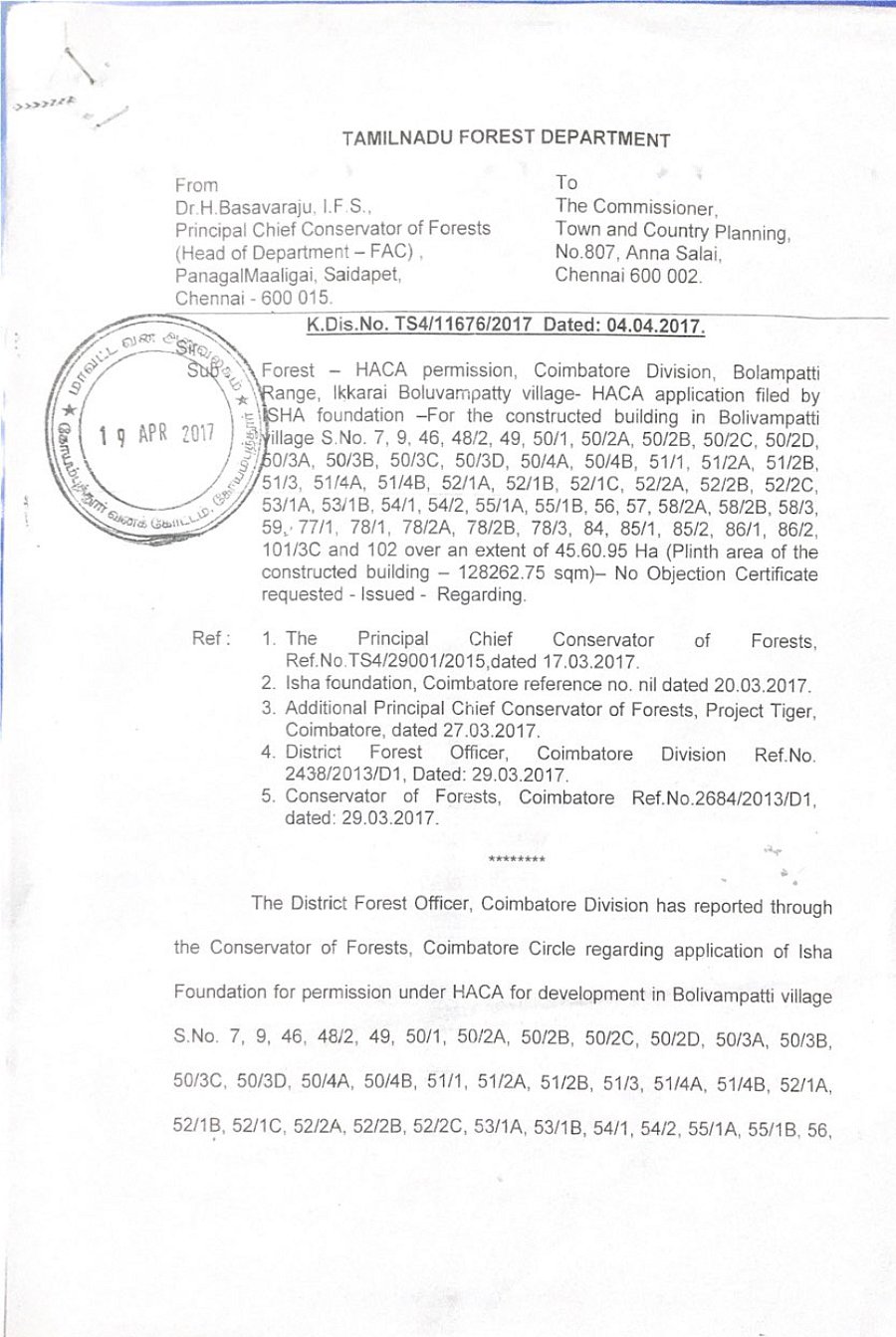 सीएजी की रिपोर्ट पर प्रतिक्रिया देते हुए ईशा दावा किया कि उन्हें HACA की मंजूरी मिल गई है16 मार्च, 2017 को उनके सभी निर्माणों के लिए। लेकिन ईशा परिसर का निरीक्षण करने और इसके आवेदन पर निर्णय लेने के लिए प्रधान मुख्य संरक्षक द्वारा गठित समिति का गठन 17 मार्च को ही किया गया था, और 29 मार्च को अपनी रिपोर्ट प्रस्तुत की। वास्तव में, यह था' 4 अप्रैल तक प्रधान मुख्य संरक्षक ने ईशा को निर्माण के बाद की मंजूरी देने के लिए शहर और देश की योजना बनाने के लिए एक सशर्त सिफारिश की। बदले में, योजना विभाग ने 3 मई को कोयंबटूर में अपने क्षेत्रीय उप निदेशक को ईशा को निर्माण के बाद जारी करने का निर्देश दिया, बशर्ते वे आवश्यक शुल्क का भुगतान करें और वन विभाग की शर्तों का पालन करें। फिर एचएसीए के लिए 16 मार्च को ईशा के निर्माण को मंजूरी देना कैसे संभव है?